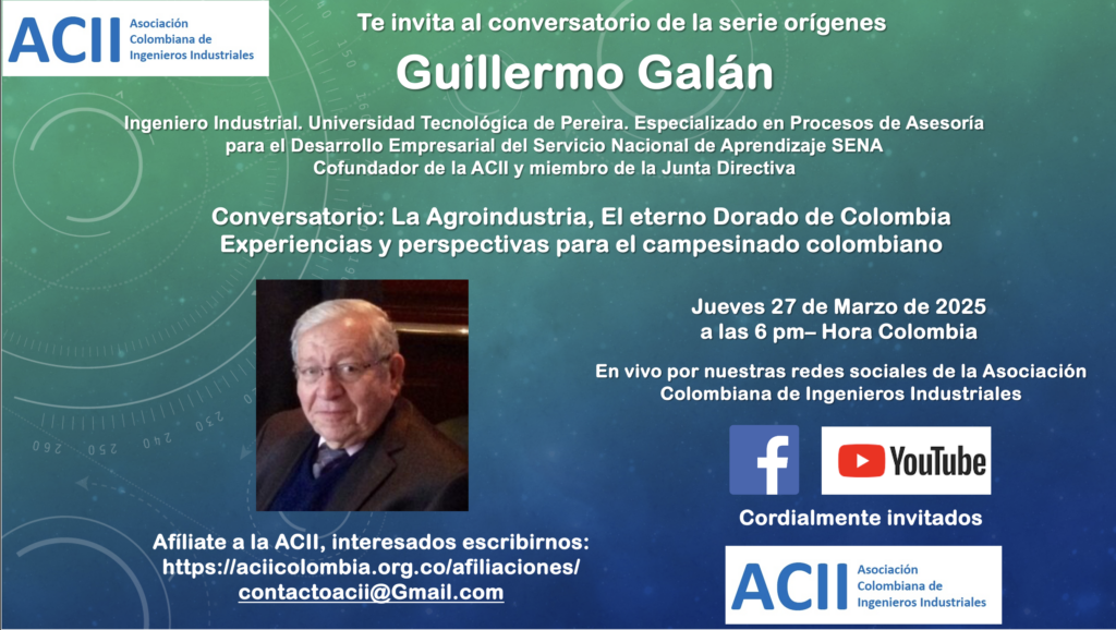 #Orígenes El pasado Jueves 27 de Marzo tuvimos el primer conversatorio del año con el ingeniero Guillermo Galán, con el importante tema «La Agroindustria, el eterno Dorado de Colombia, experiencias y perspectivas para el campesinado» veremos sus experiencias con el modelo de transformación agraria junto al primer Software aplicado (1985) al campo en diversas partes de Colombia, El Salvador e Israel, entre otros países. Pueden volver ver el conversatorio nuestro canal de Youtube: