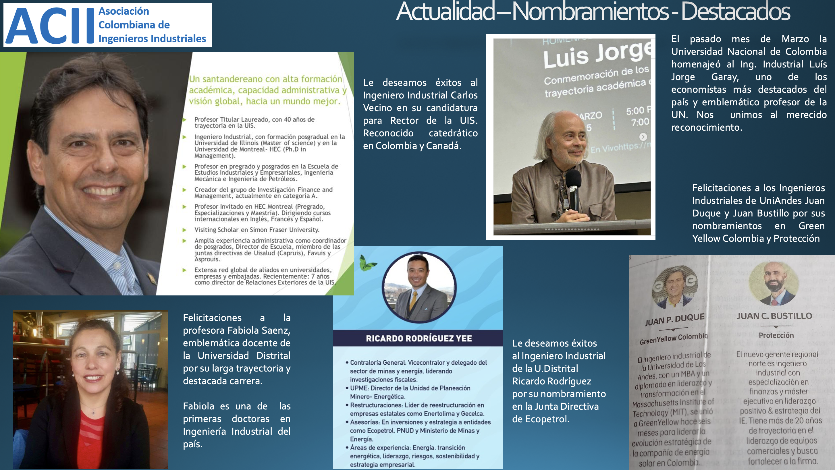 La Asociación Colombiana de Ingenieros Industriales felicita a los siguientes Ingenieros Industriales por sus nombramientos y reconocimientos a sus carreras y les desea éxitos: