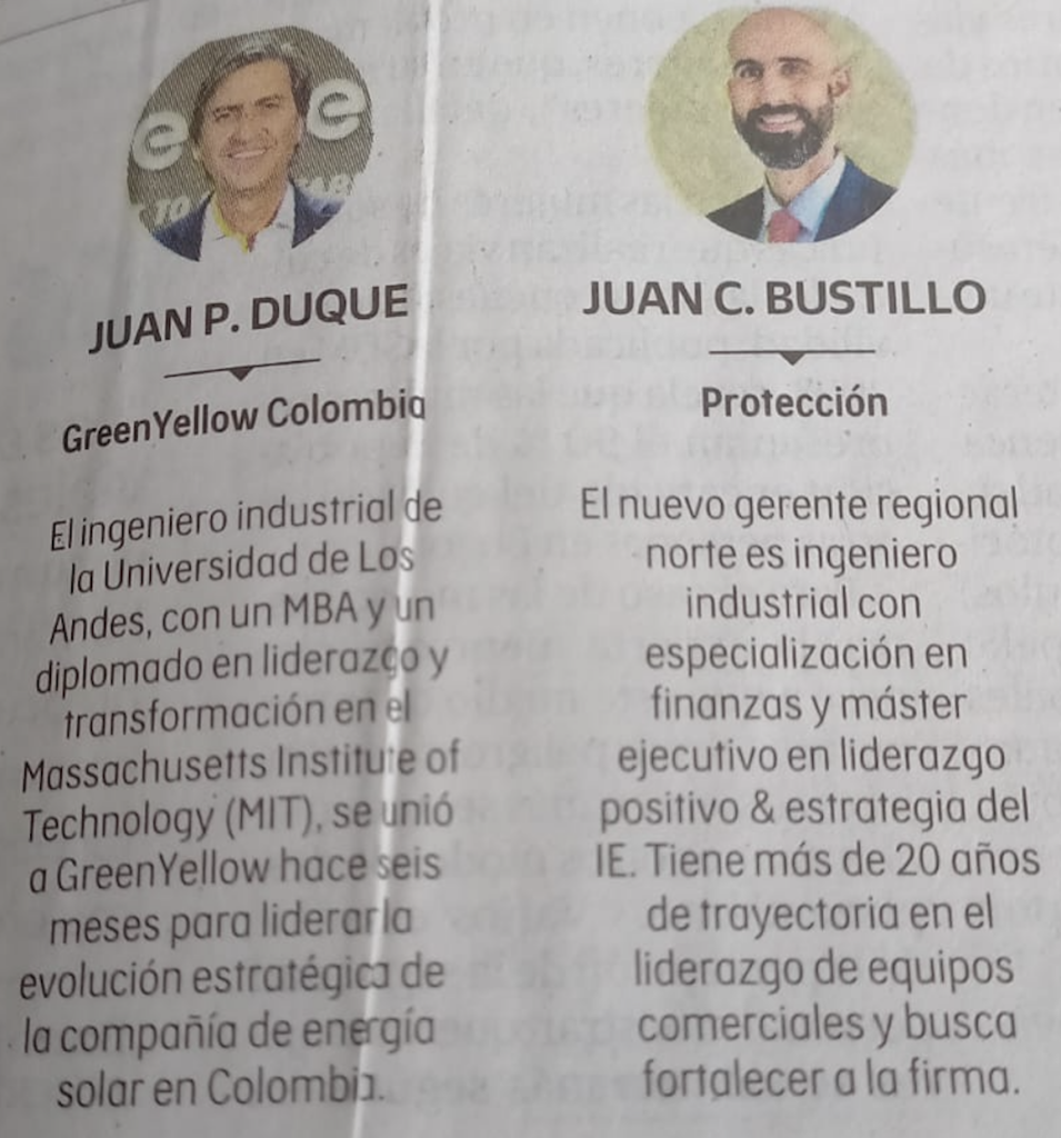 5. Felicitaciones a los Ingenieros Industriales de UniAndes Juan Duque y Juan Bustillo por sus nombramientos en Green Yellow Colombia y Protección.