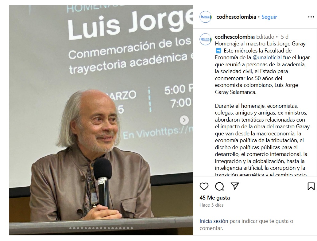 2. El pasado mes de Marzo la Universidad Nacional de Colombia homenajeó al Ing. Industrial Luís Jorge Garay, uno de los economístas más destacados del país y emblemático profesor de la UN. Nos unimos al merecido reconocimiento.